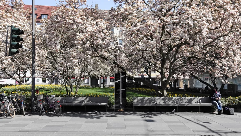 Infosteele for the memory of the former Jewish shopkeepers on the Kaiserstraße and Kaisergärtchen with its fabulous Magnolia trees.