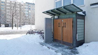 This demanding renovation of the existing 1950s residential building by architect Erik Bryggman was done through research into the original ideas and drawings of the famous architect, and of the circumstances and requirements of the contemporary construction site. The chosen materials, colours and detailing followed the 1950s atmosphere as much as possible, ranging from copper, Palisander wood to glass blocks. The new electronic addressing system, for 144 apartments, was intergrated inside a single, massive Kuru-granite which was placed on its own foundation. The residents gave it a nickname Monoliitti - like the black Monolith from Stanley Kubrick's film 2001 A Space Odyssey.