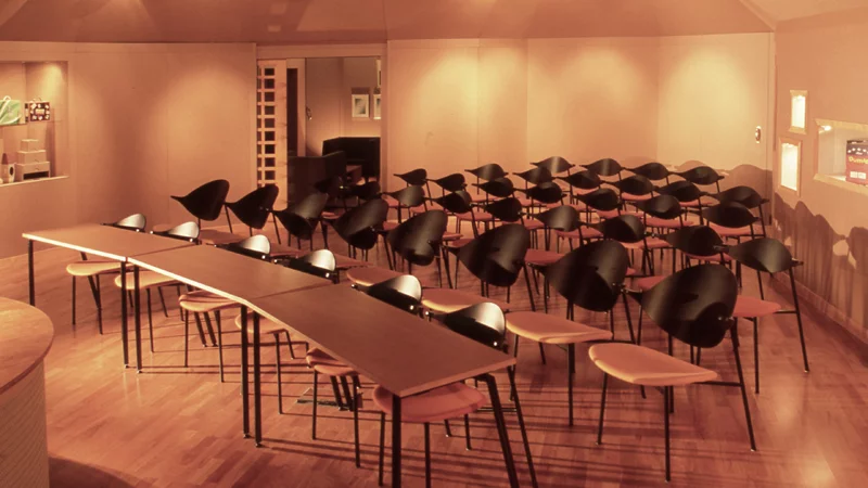 Interior design for the main marketing and exhibition space at the Neopac Metsä-Serla cardboard factory. The invited competition was won with an idea of using the factory’s own products - corrugated cardboard - as the surface material. A wide range of different cardboards were used, fineliner for details, heavyload for walls, and water resistant pizza-packaging for the kitchen. Also some furniture, light fixtures, objects, vitrines were produced following the same principle. And all were fixed to the background veneer boards with double-sided tape! As an architectural contrast to the rational factory building, the intimate, warm interior was a positive surprise to personnel and visitors alike.