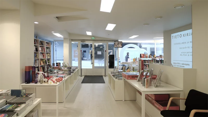 Monochromatic, multistorey bookshop interior for the Building Information Ltd (Rakennustieto).