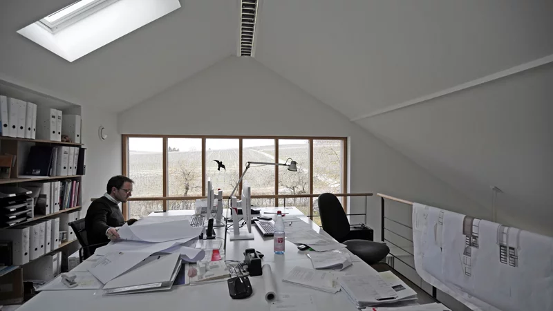 Research project into the creative spaces of architects in and around Würzburg. The results of the interviews and photo shoots will be published in a limited edition. Above photograph was taken at the Jäcklein Architekten in Volkach on 27 March 2019, and shows the loft in the main studio space with a grand view to the local vineyards.