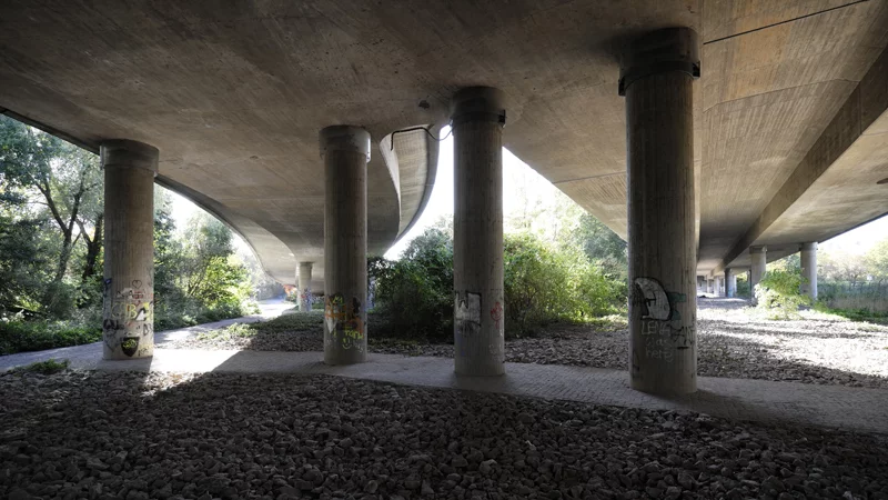 Take the Konrad Adenauer Bridge (B19) in Heidingsfeld, which spans the River Main. The area beneath it shows strong potential for development, thanks to its excellent connectivity via Mergentheimer Straße - accessible by car, public transport, bike, and on foot - as well as its proximity to the Dallenberbad tram stop and the river itself.
