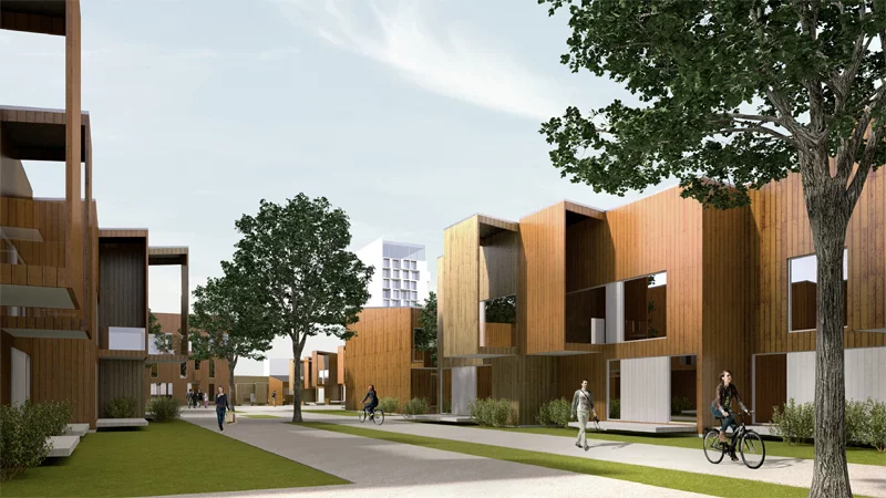 Urban Planning Ideas Competition to the former horse racing track in Vaasa. Human scale urban housing with car-free pedestrian pathways became one of the core ideas for this competition proposal. The white highrise building acts as the landmark and wayfinding symbol for the dense and low wooden housing area.